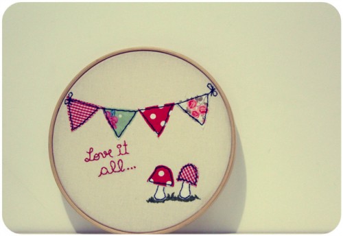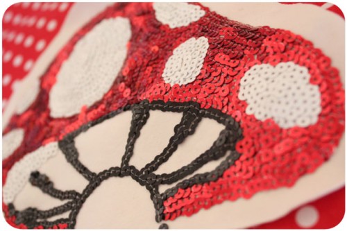 Esse cogumelo bordado aí de cima foi o primeiro que eu mesma fiz, em 2005! Era uma blusa branca que com o tempo ficou amarelada e aí eu resolvi guardar o bordado quando me desfiz da blusa. Coloquei o pano vermelho com bolinhas no fundo para fotografar mas, acho que acabo de criar uma almofada, né?