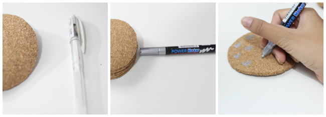 Passo 4: Desenhe! Usei uma caneta gel branca e também essa prateada power marker da Compactor. O resultado da caneta gel branca (facilmente comprada em papelarias) agradou mais, apesar de ter comprado a prateada especialmente para fazer o porta copos #diyfail