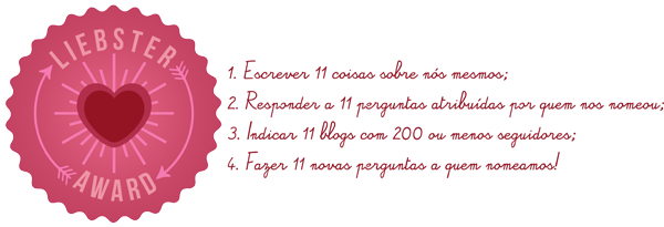 Não é de hoje que recebo indicações para responder memes aqui no blog. Antes de tudo, quero pedir desculpas às meninas que me indicaram em alguns memes e por ventura, não consegui responder ou acabei perdendo o timing. Juro que não foi por falta de vontade, mas a gente acaba priorizando outras coisas e sem querer esquece ou deixa passar. Então, em nome de todas essas indicações já recebidas junto da vontade de expor algumas curiosidades sobre a minha pessoa, hoje é dia de responder o Liebster Award (amei o selo), indicado pela Ju Sacramento, do Tem no Meu Quintal.